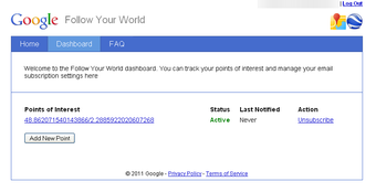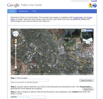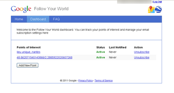 Follow your World est une application web gratuite proposée par Google. Une fois inscrit, l'utilisateur reçoit une notification via email à chaque modification des images d'un lieu sélectionné sur Google Maps et Google Earth.